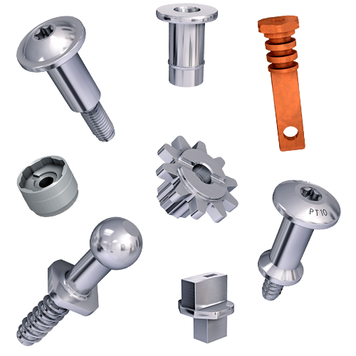 The special optimisation possibilities for EJOFORM® products are best illustrated by an example. The EJOFORM® cold-formed component (image to the right) is produced in a 5-step cold-forming process and it saves ca. 25% of material compared to a turned part (image to the left). Other application engineering advantages also arise. For example, the EJOT solution with integrated external hexagon recess can transfer much higher tightening torques compared to the slotted recess of the turned part. The EJOFORM® cold forming part can also be equipped with every type of thread (here DELTA PT®), in order to meet all possible requirements and materials.